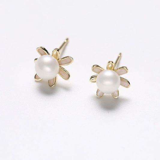 Pendientes de girasol dorado de plata maciza S925 con auténtica perla de agua dulce