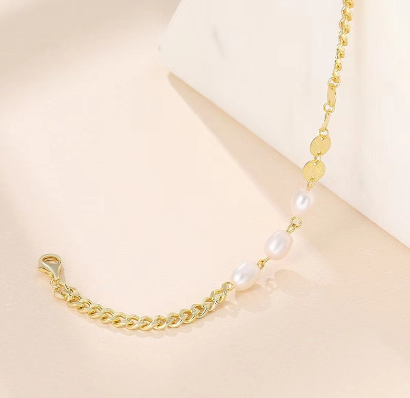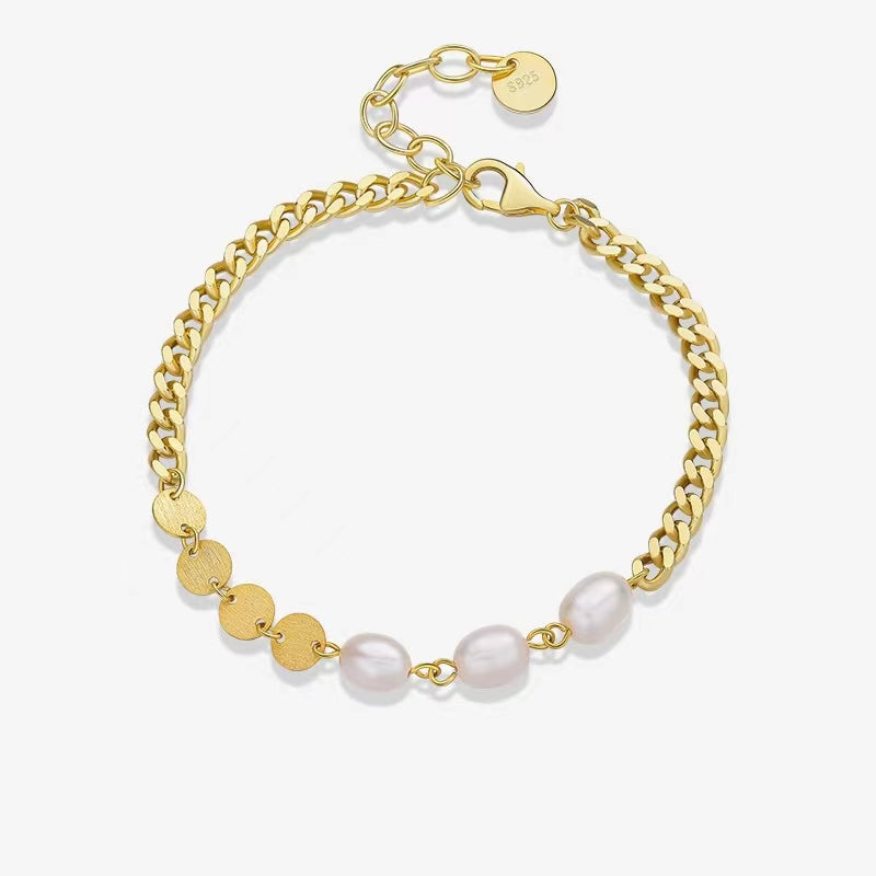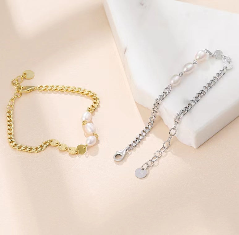 Pulsera de tres deseos de plata maciza S925 con perlas de agua dulce genuinas