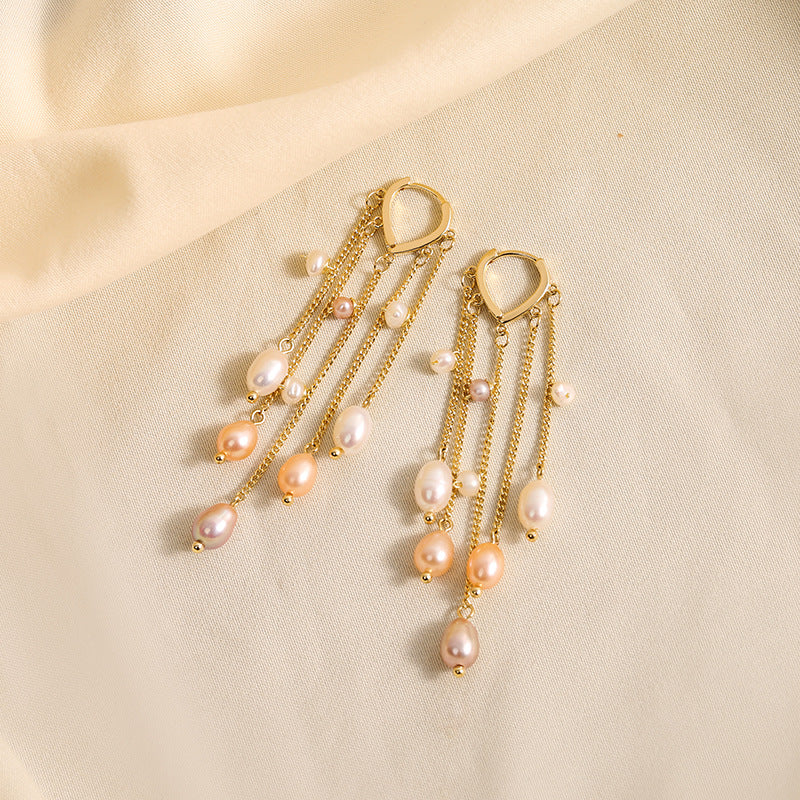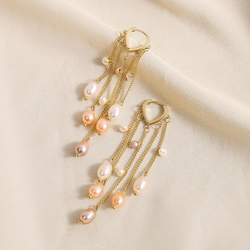 The Radiance Tassel Earrings exude modern grace with five cascading gold alloy chains adorned with 5–6mm freshwater pearls in white, pink, and lavender hues. Each strand dances with light, creating a delicate balance of elegance and individuality — perfect for women who love timeless glamour with a unique twist.