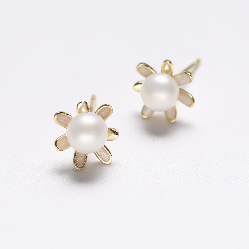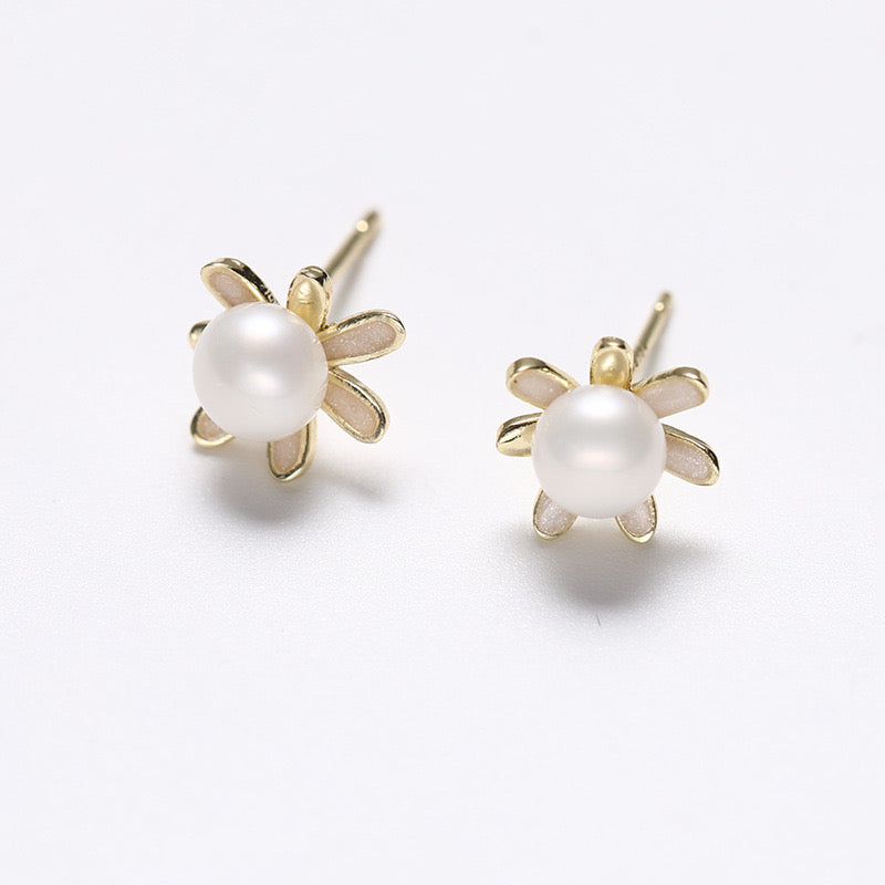 Pendientes de girasol dorado de plata maciza S925 con auténtica perla de agua dulce
