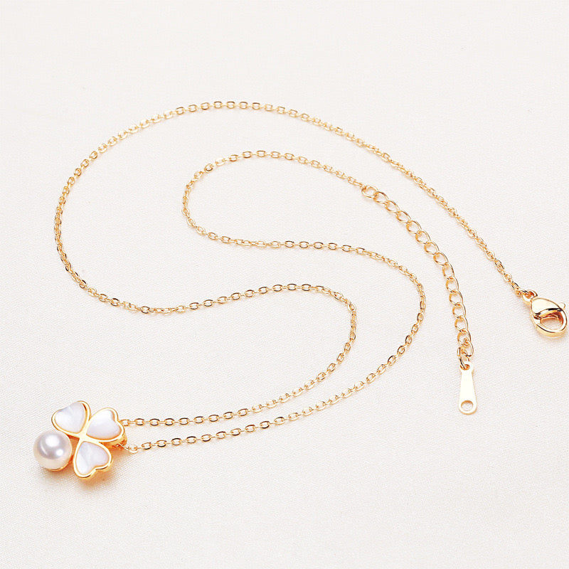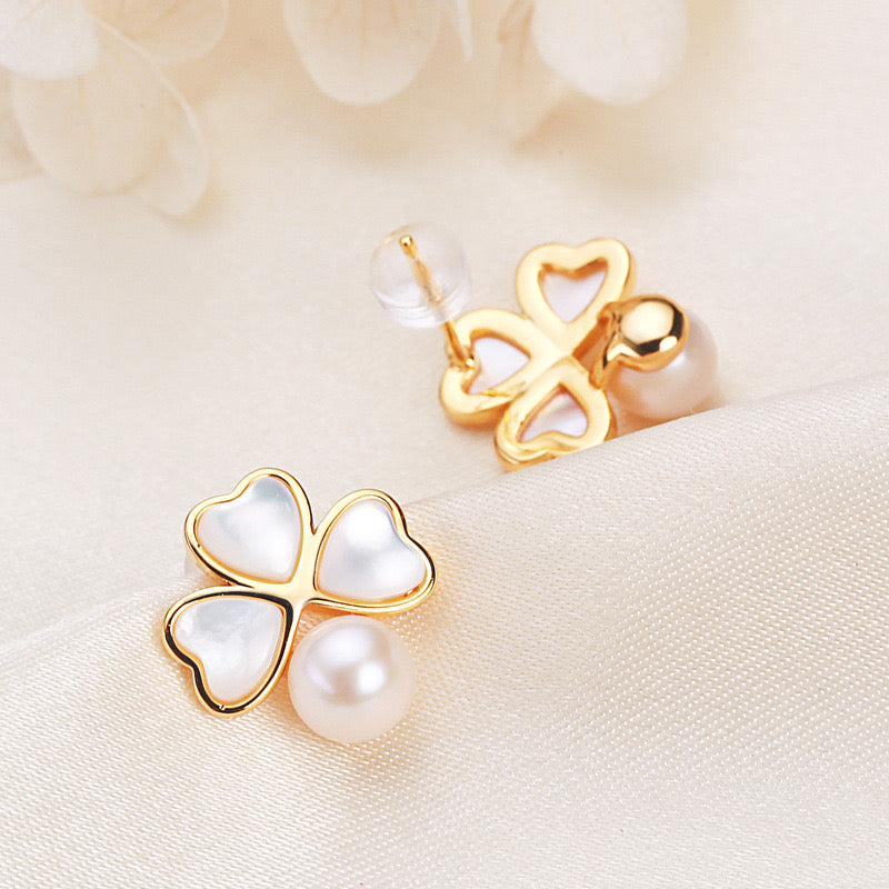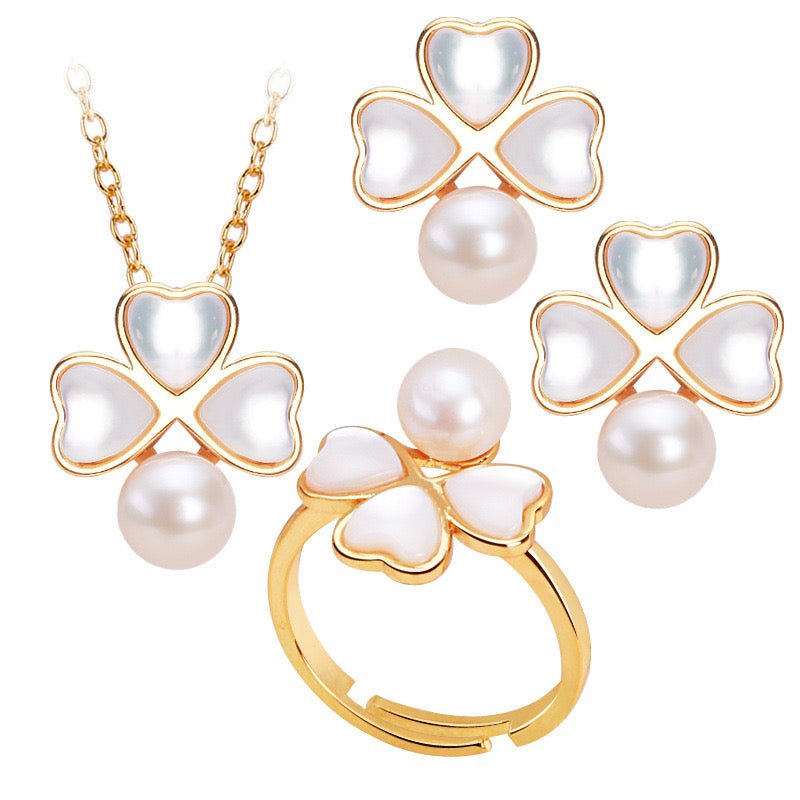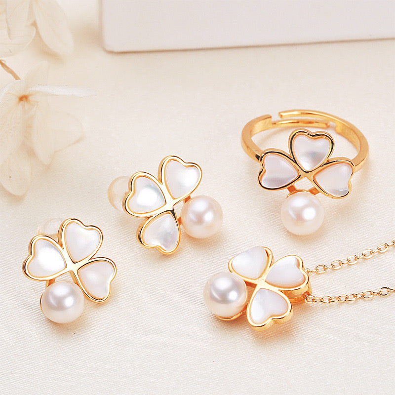 Ensemble de trèfle porte-bonheur en laiton plaqué or 18 carats avec véritable perle d'eau douce