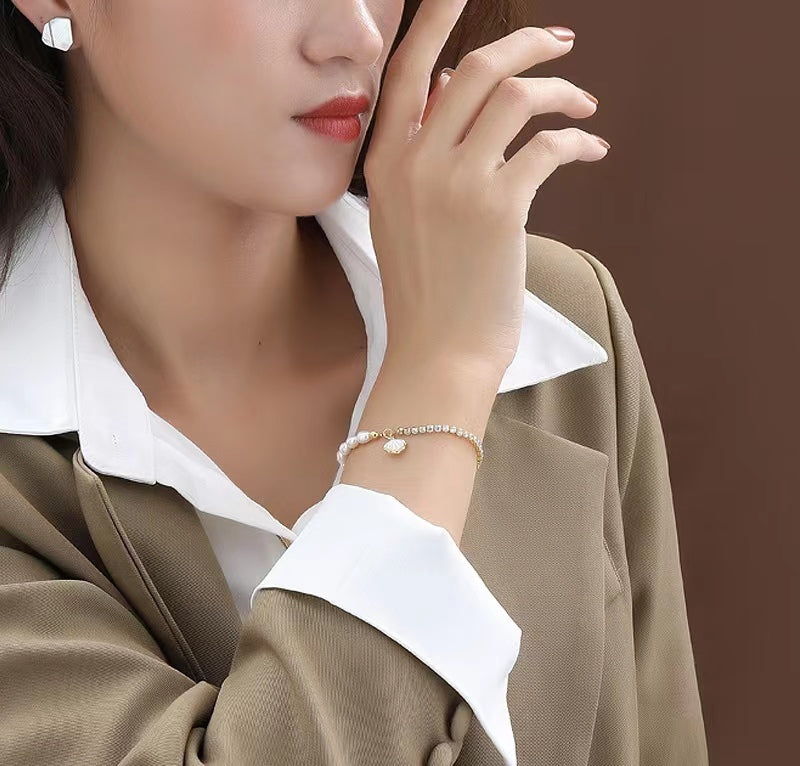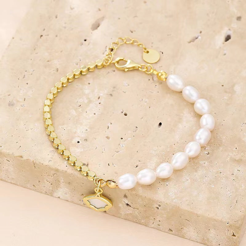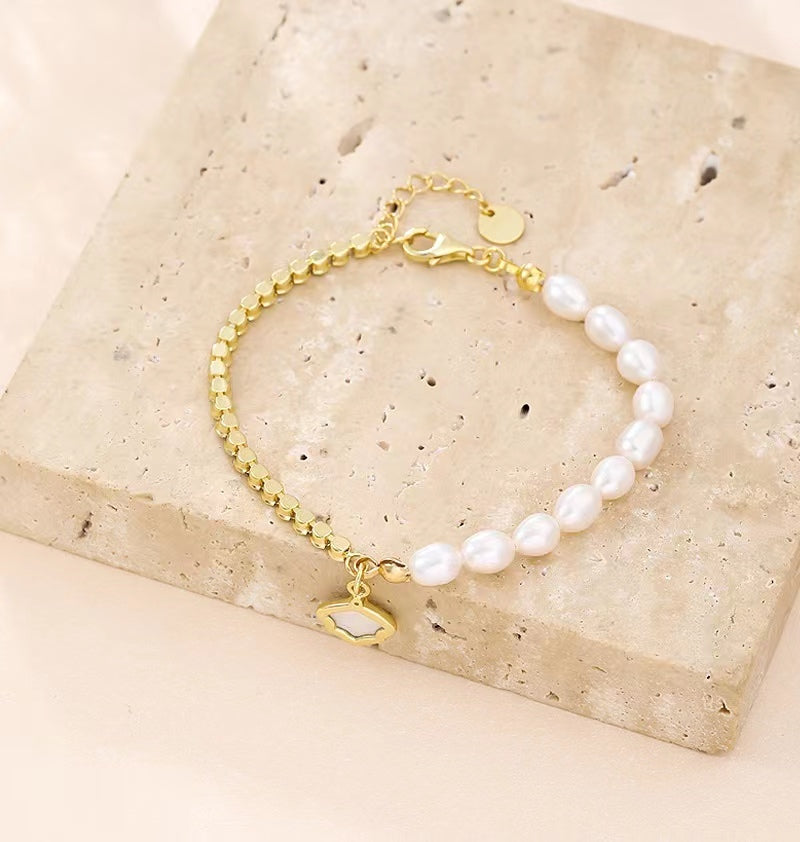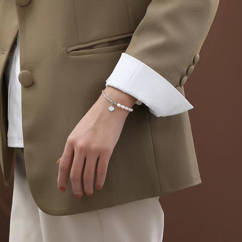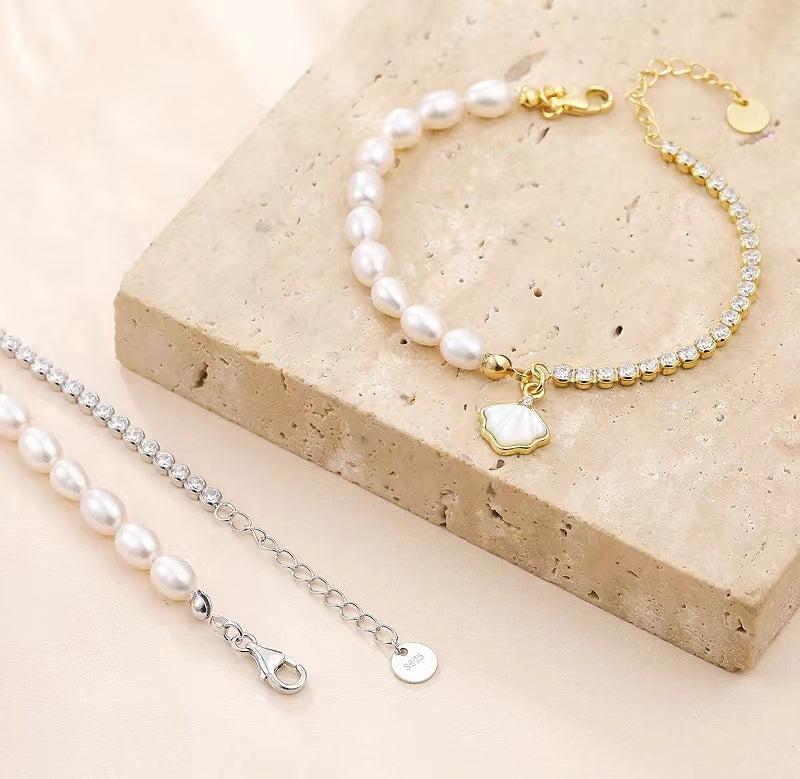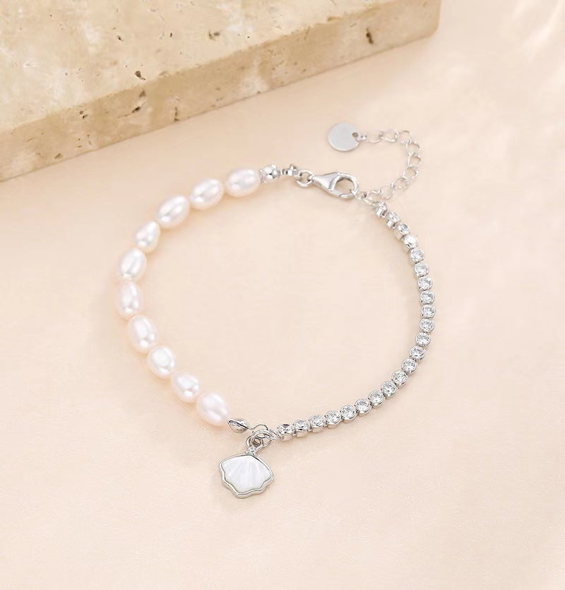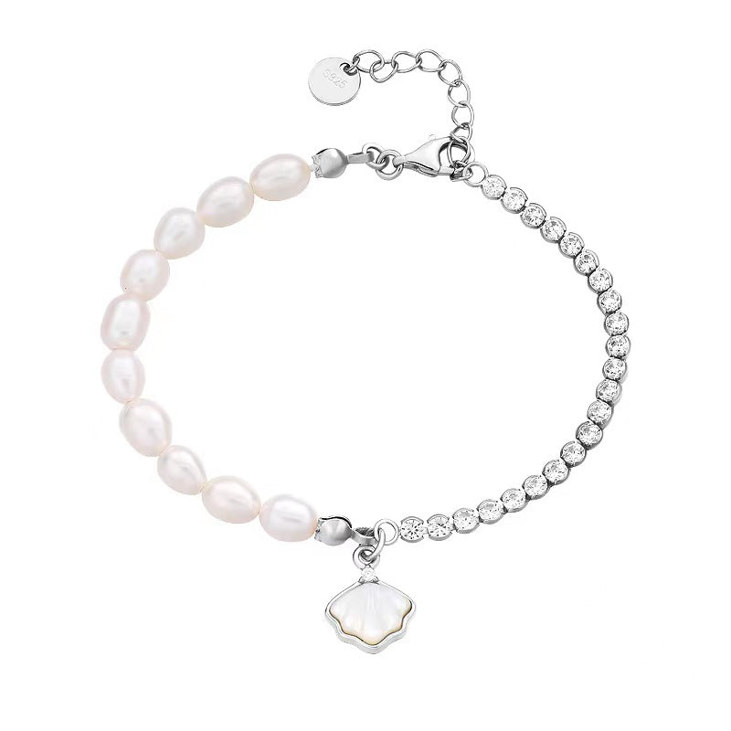 Bracelet coquillage en argent massif S925 avec véritable perle d'eau douce