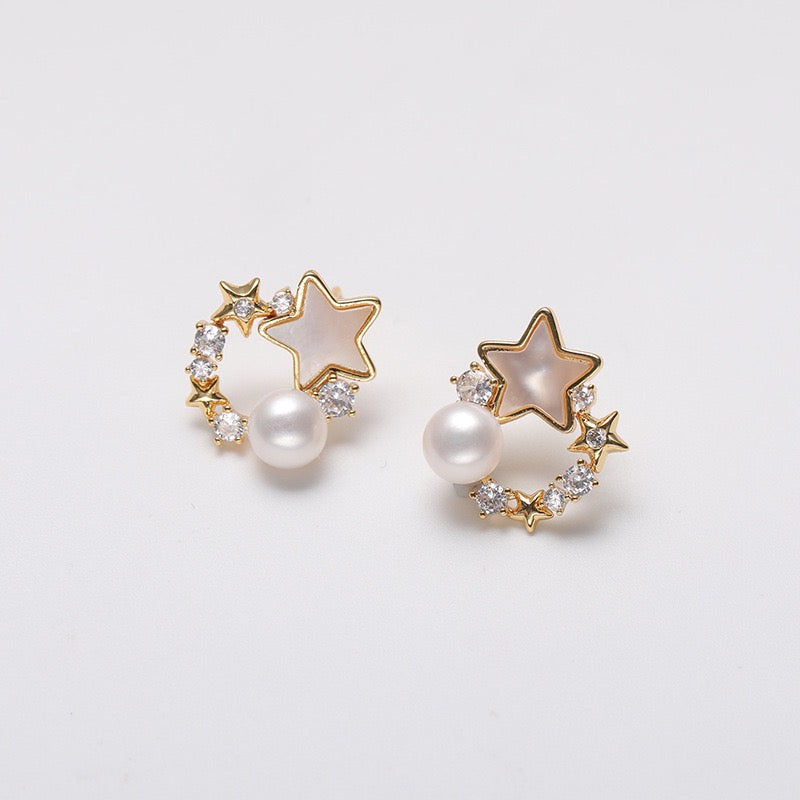 Boucles d'oreilles en argent massif S925 avec perles d'eau douce véritables et étoiles