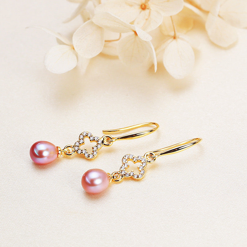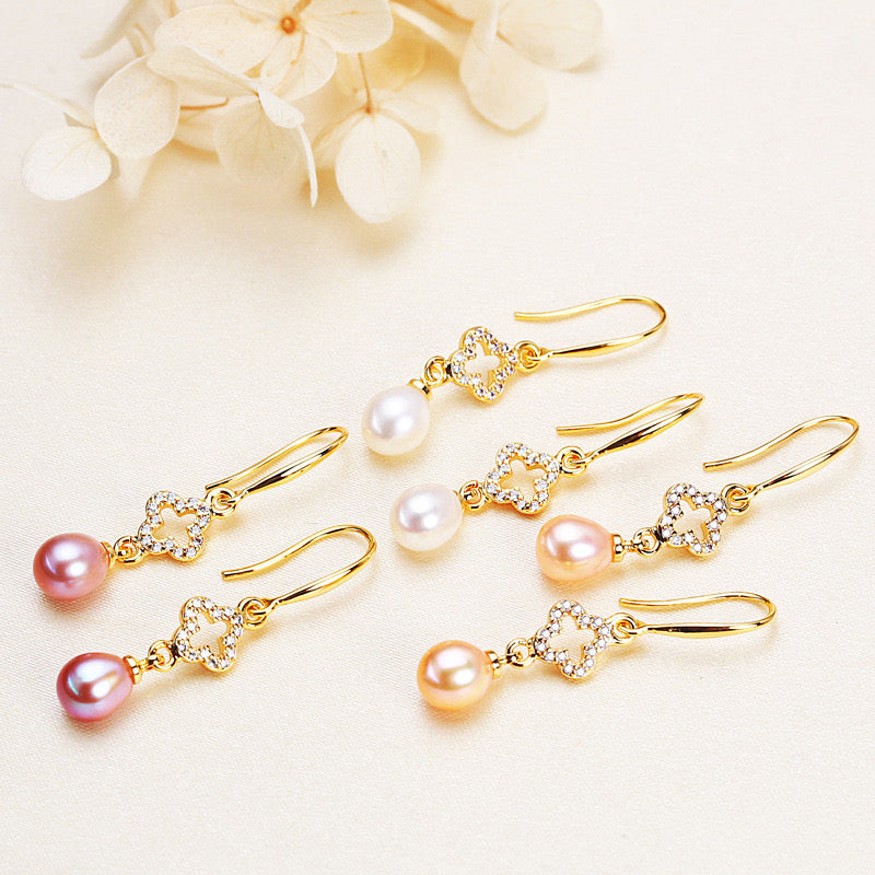 Elegant drop earrings featuring a sparkling cubic zirconia clover suspended above a lustrous teardrop pearl. The golden clover symbolises good fortune whilst the graceful pearl drop adds timeless sophistication.