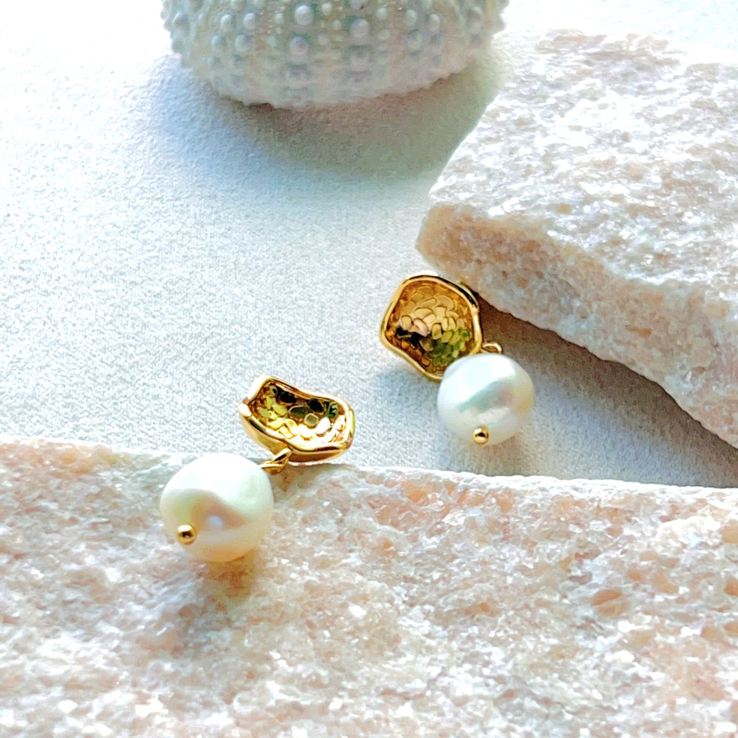 Lustrous baroque pearls beautifully framed by sleek gold flap details. These sophisticated earrings showcase the natural beauty of baroque pearls with a contemporary twist, creating an effortlessly chic look.
