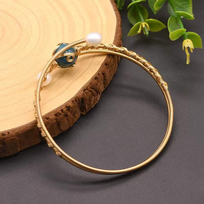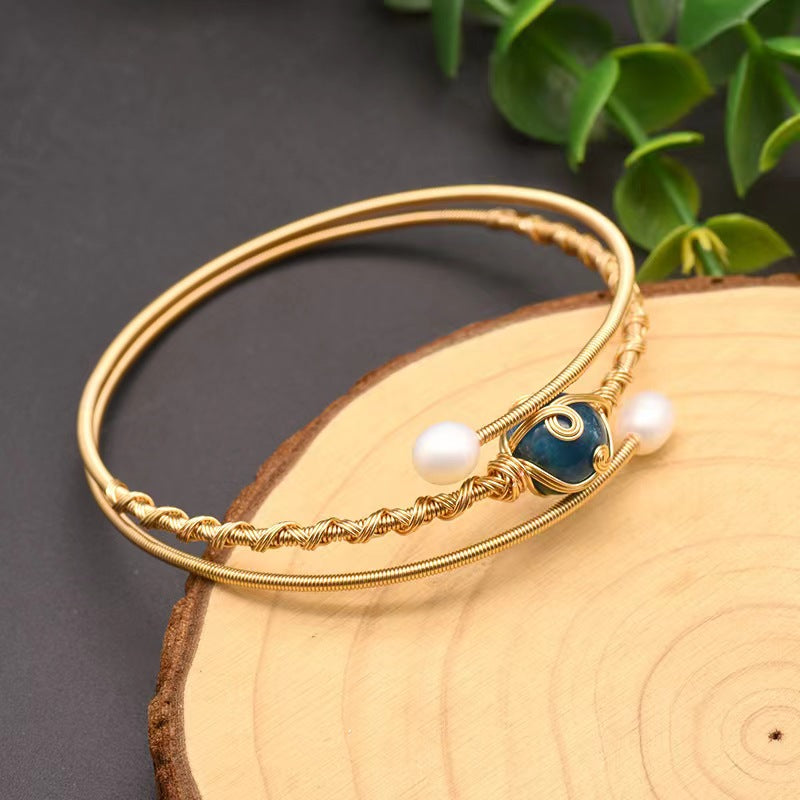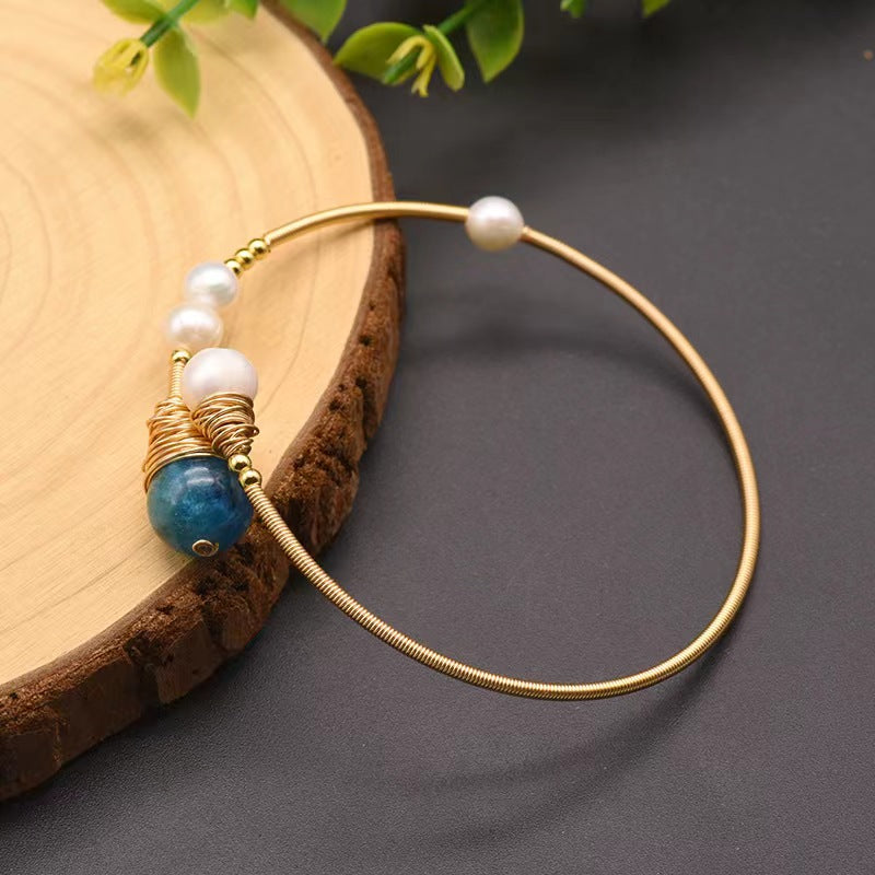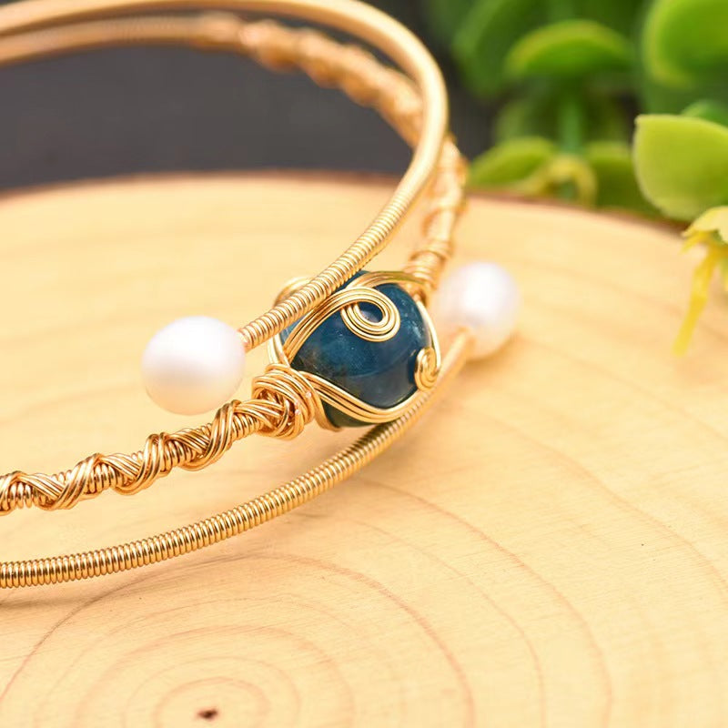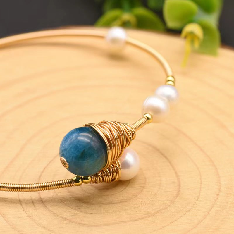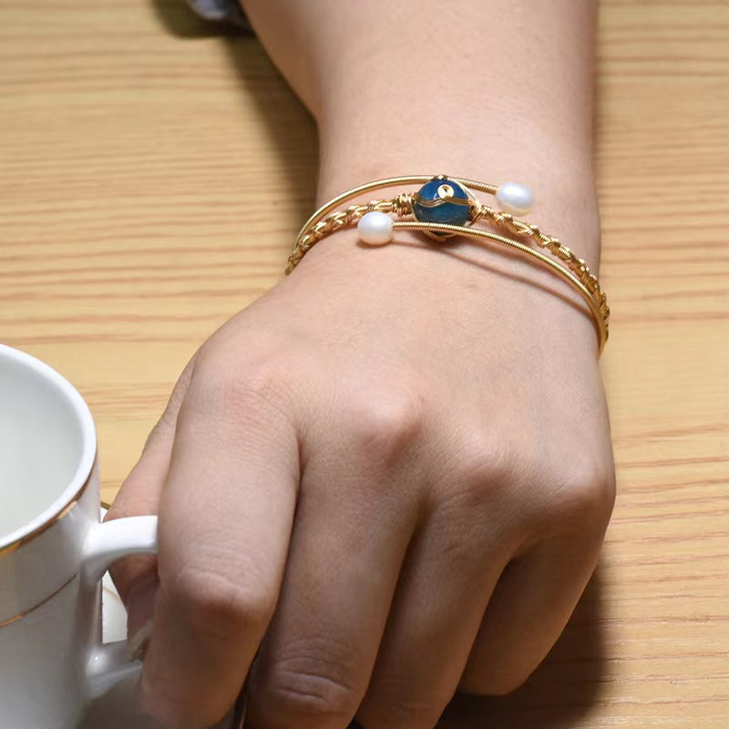 This exquisite three-piece bracelet set showcases lustrous freshwater pearls beautifully combined with vibrant aquamarine and kyanite gemstones, all connected through intricate wire-wrapping craftsmanship. The sophisticated design embodies both natural beauty and contemporary appeal, creating statement pieces for the discerning woman who values exceptional quality and unique style.