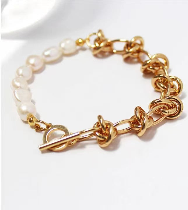 This striking bracelet features a unique design combining lustrous baroque freshwater pearls with bold knotted chain detailing, creating the perfect balance of organic beauty and urban chic. Available in both 18K gold-plated and platinum-plated brass finishes, each piece is crafted for the modern woman who appreciates innovative design.