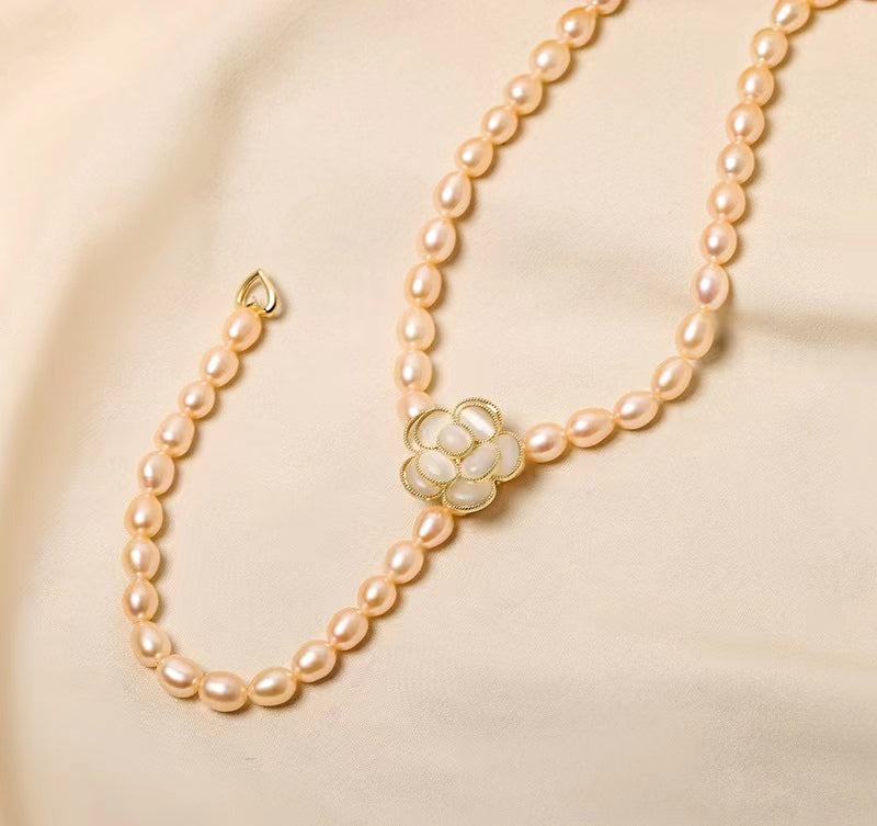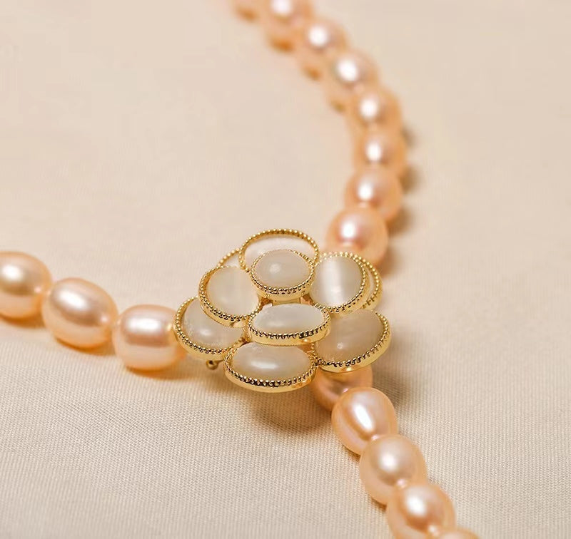 This exquisite necklace features lustrous pink freshwater pearls in elegant oval shapes, beautifully complemented by an artistic rose centrepiece with sparkling accents. Designed for the discerning woman who appreciates both classic refinement and contemporary artistry.