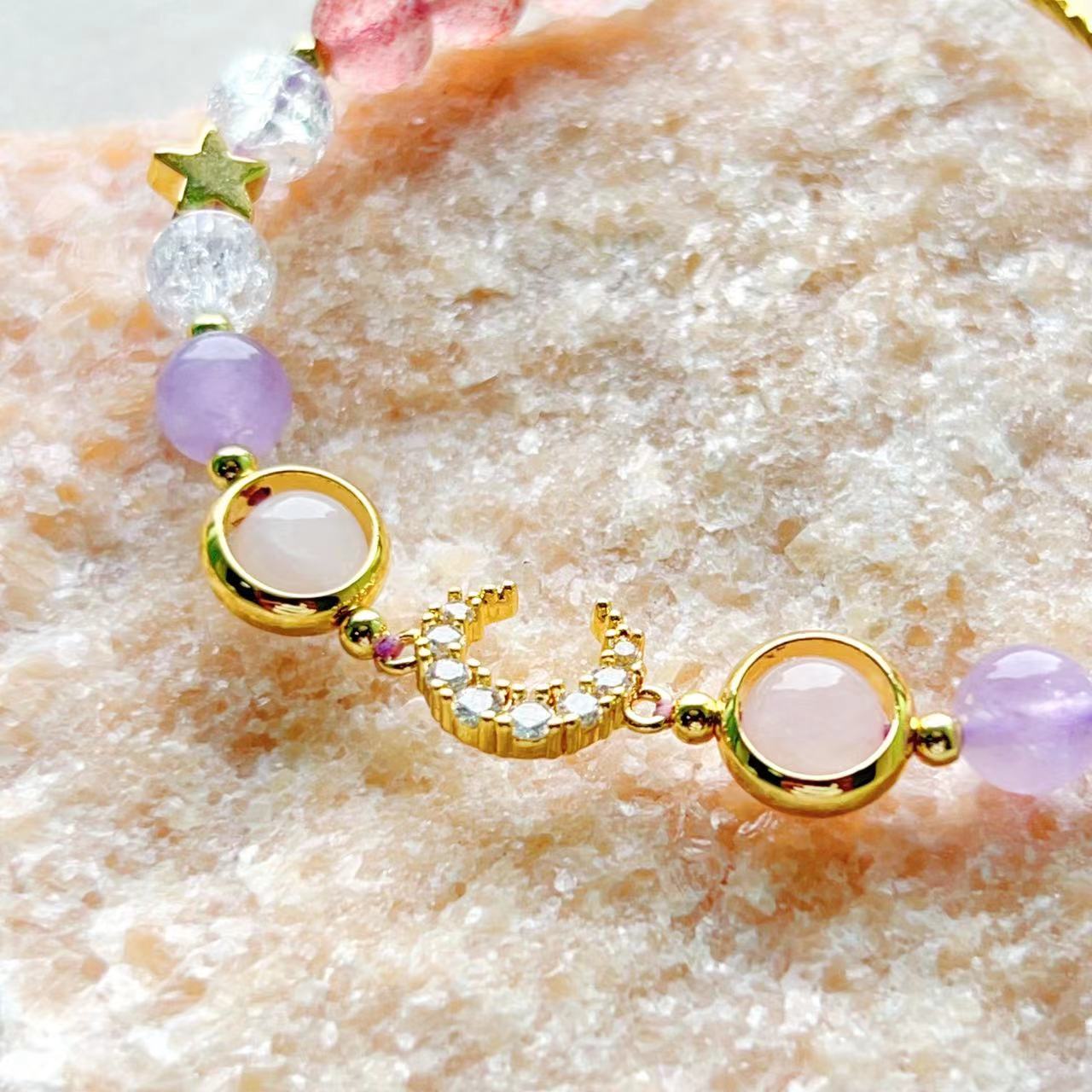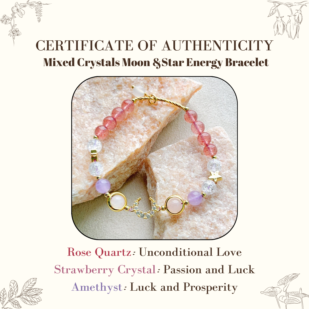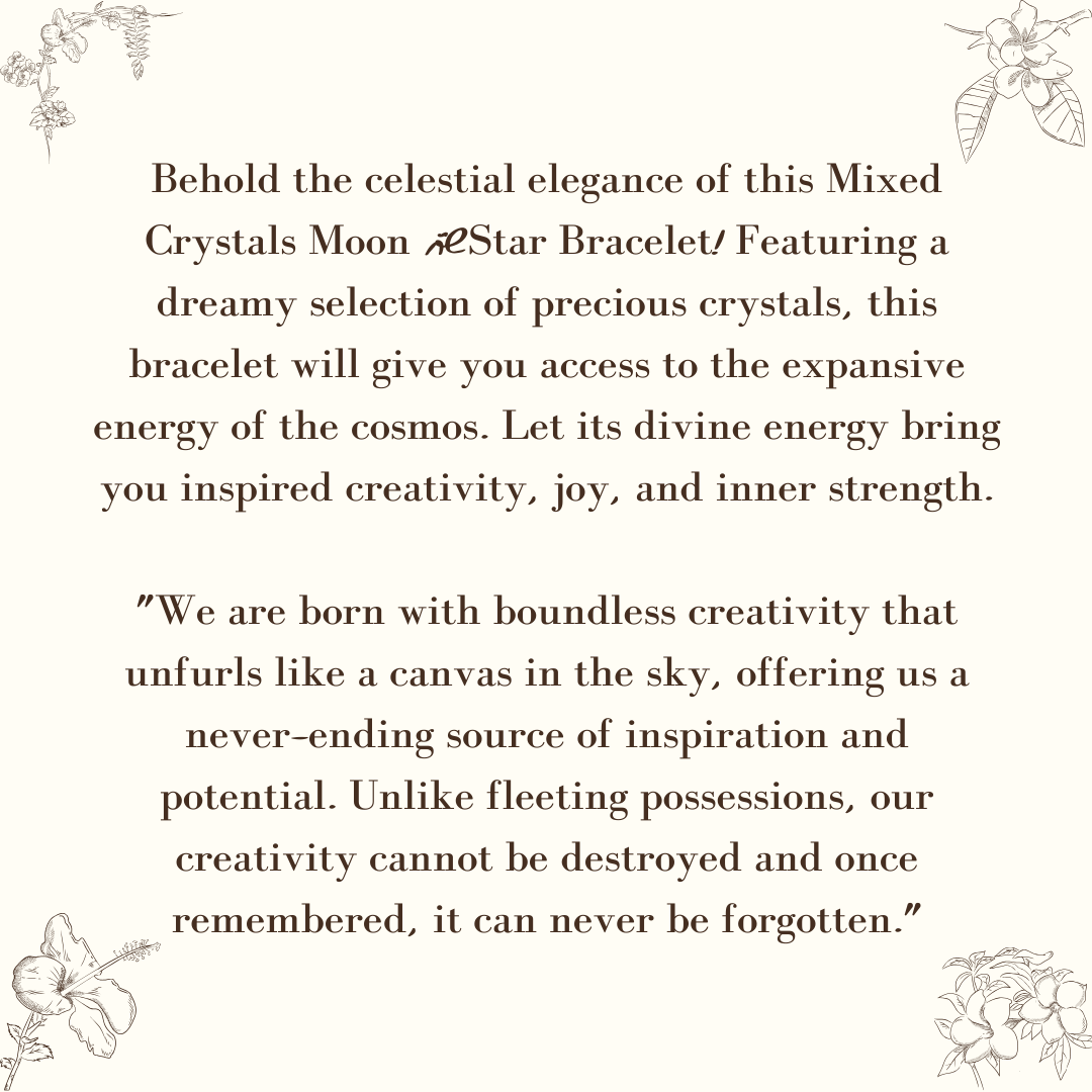 Behold the celestial elegance of this Mixed Crystals Moon &Star Bracelet! Featuring a dreamy selection of precious crystals, this bracelet will give you access to the expansive energy of the cosmos. Let its divine energy bring you inspired creativity, joy, and inner strength.